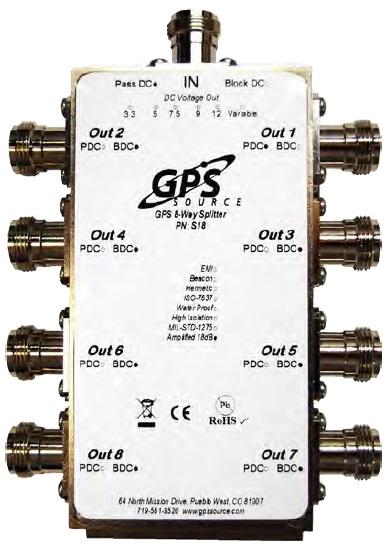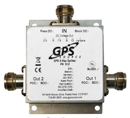 GPSスプリッターは、1つのGPSアンテナからの信号を複数のポートに出力するための装置です。GPSアンテナへ電圧を送るために、1つの出力ポート(J1)はDCスルーとなっており、それ以外のポートは200Ωの抵抗により、電圧が供給されないようになっております。またオプションにより、AC電源より電圧が供給されるタイプもご用意しております。