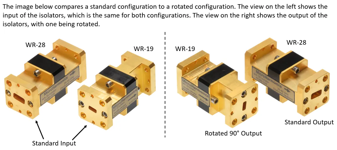 標準アイソレーター構成では、2つのフランジは同一直線上にあり、入力導波管と出力導波管が同一平面上にあるように配置されています。ご要望に応じて、フランジの1つを90度回転させる構成も可能です。これにより、フランジは同一直線上にありながら90度のねじれが生じます。現在、90度曲げのあるアイソレーターは提供しておりません。2つの構成を比較した画像については、ここをクリック。