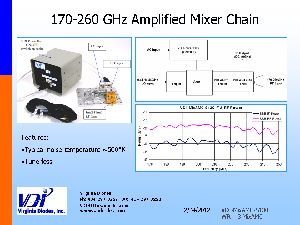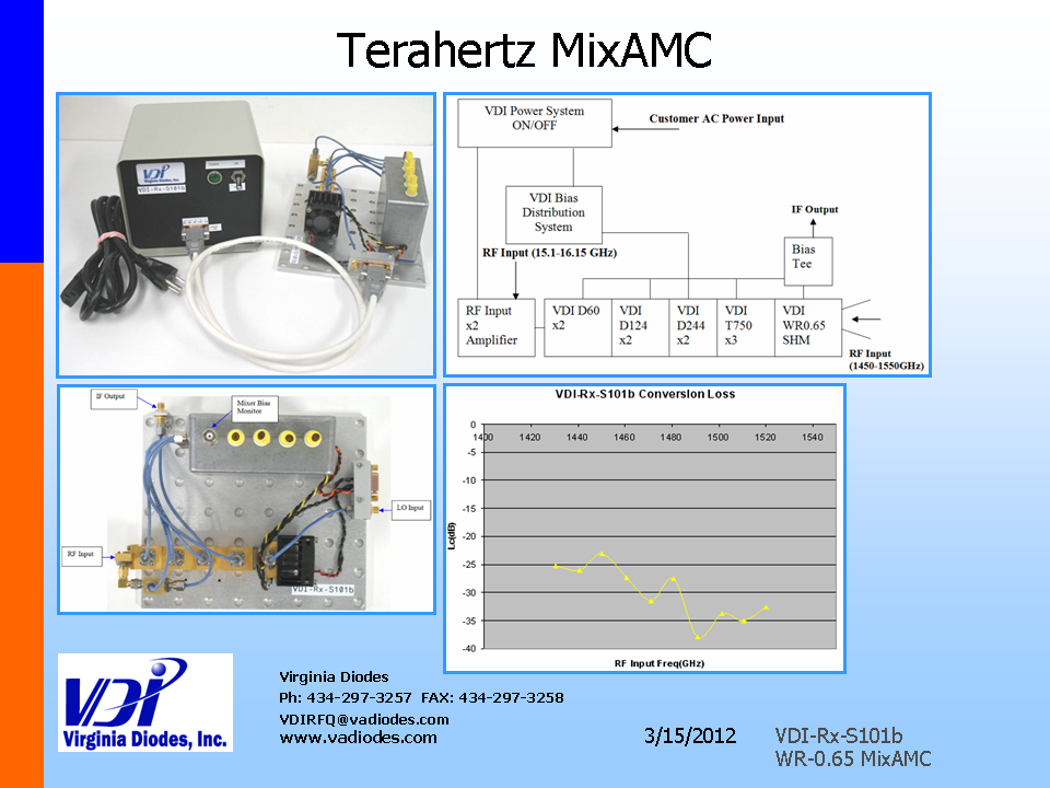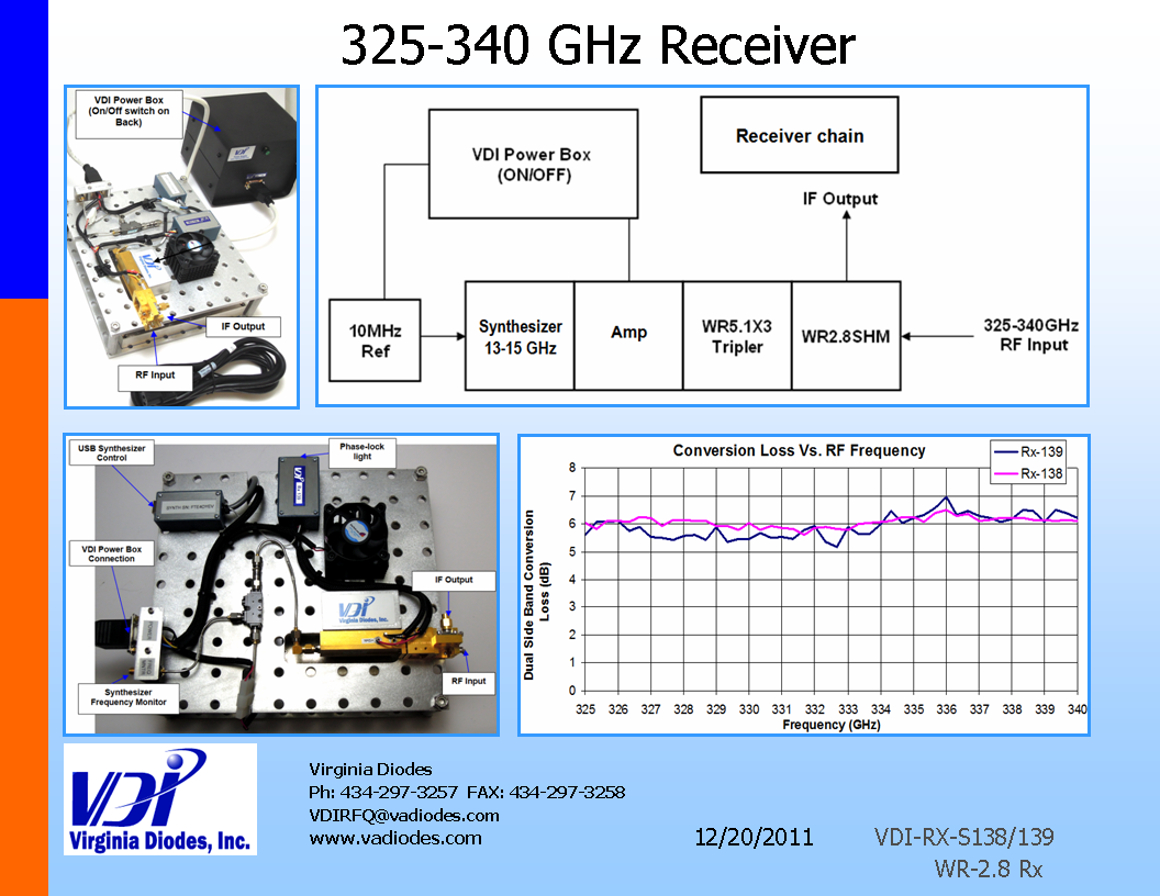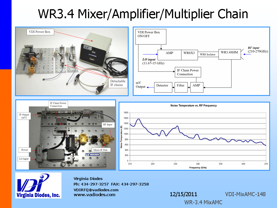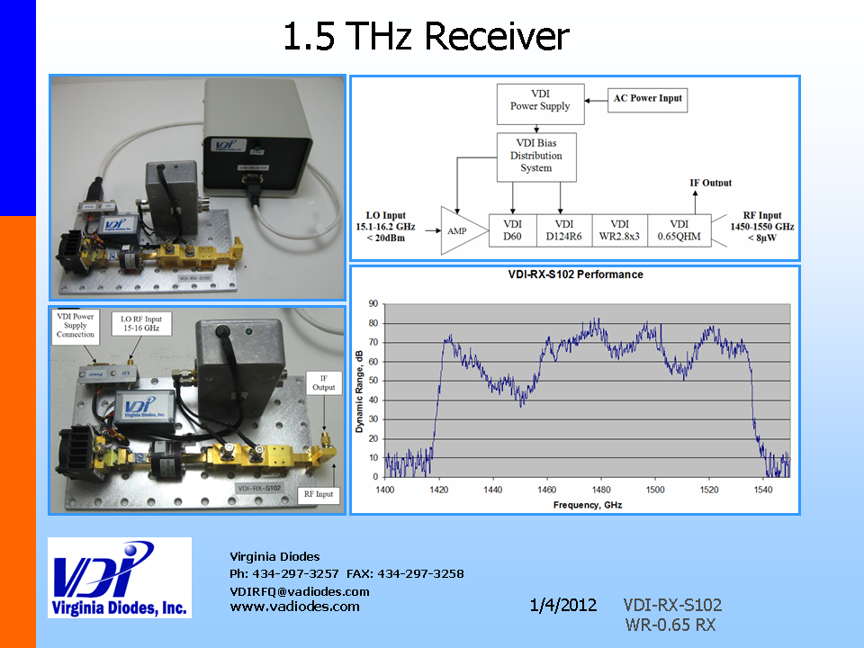 Virginia Diodes(VDI)社は50GHz~3THzに対応する幅広いミリ波レシーバーシステムを提供します。これらのシステムにはVDIの周波数逓倍器と市販の増幅器および/マイクロ波ソースまたは/発振器が結合されています。